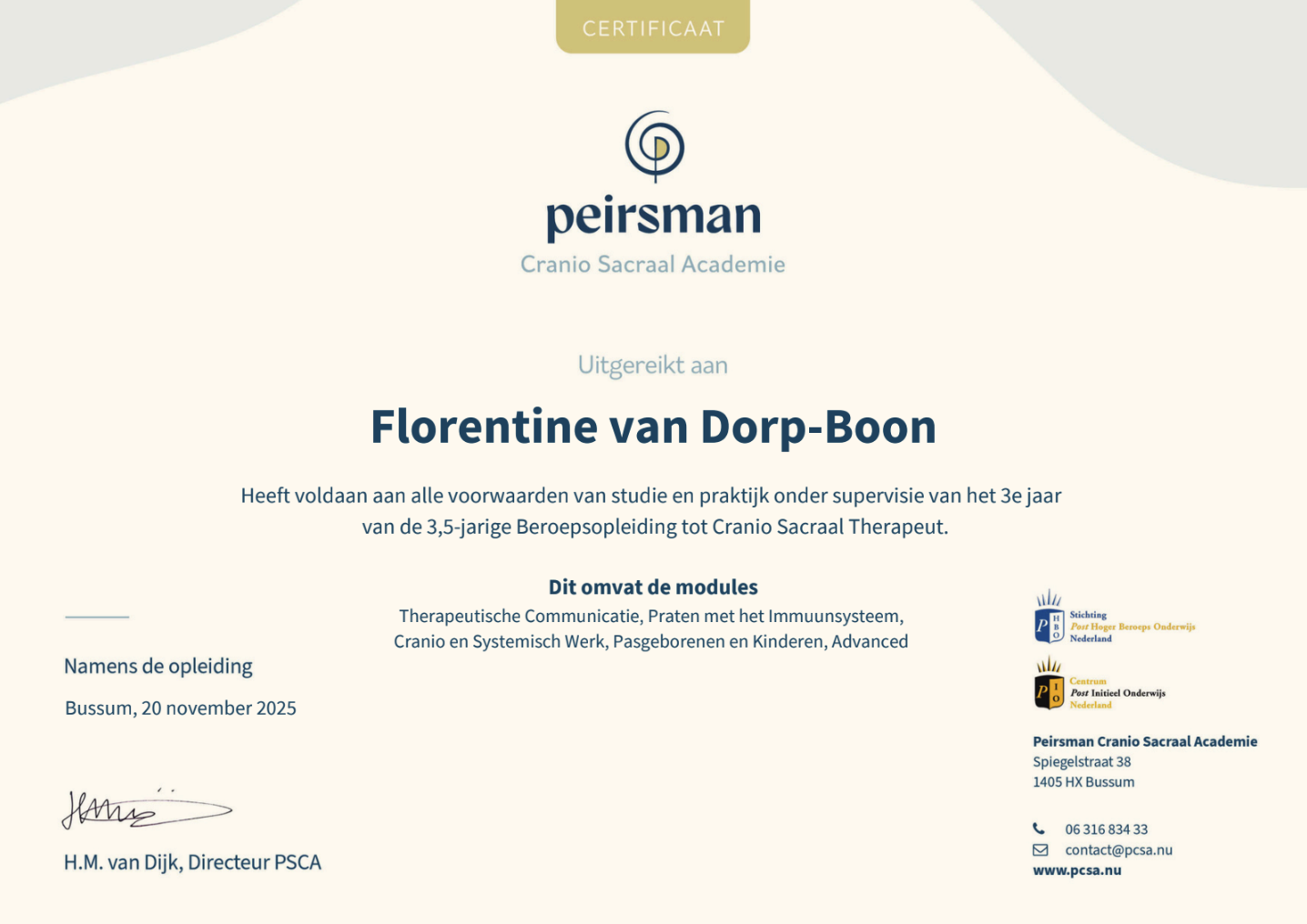 Jij lijf doet wat het moet doen, het zelf herstellend vermogen gaat aan. Door de zachte aanraking word je bindweefsel en de balans in je zenuwstelsel en in je cranio sacrale systeem verbeterd. Zo ervaar jij meer ontspanning, rust en ruimte in je lijf.